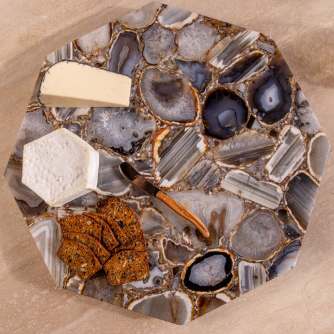 The Sia Agate Tray transforms natural agate into a functional work of art. Each stone is hand-placed in resin molds, capturing its organic beauty, and carefully polished to reveal its radiant surface. Smooth edges and a flawless finish highlight the tray’s artisanal detail, making it ideal for serving or as a centerpiece. With its unique blend of natural textures, the Sia Agate Tray is a beautiful addition to any setting.