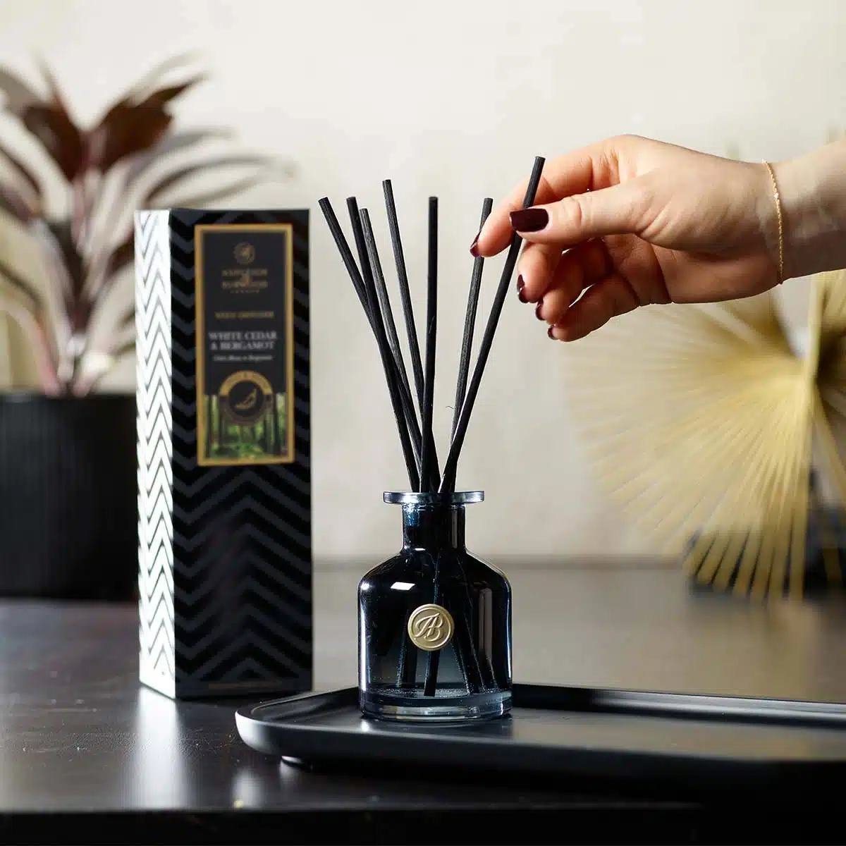 Fylltu heimilið af ferskum og hlýjum ilmi þar sem bergamot blandast við jarðbundna tóna af hvítum sedrusvið. Þessar fáguðu ilmstangir í svörtu ombre-gleri veita stöðugan og notalegan ilm í allt að 10 vikur, án reyks eða loga.