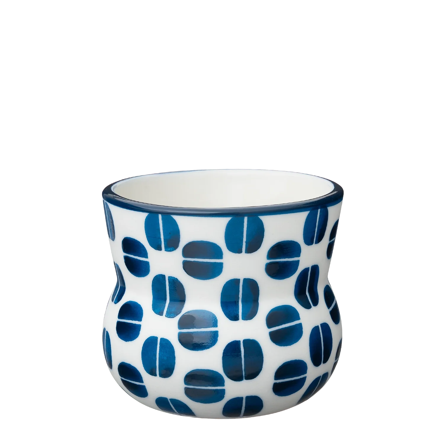Espressobollinn með mynstrinu Kaffibaunir er mótaður úr hágæða postulíni, mynstur bollans er handmálað í hinum mest einkennandi og klassíska bláa lit Ingu Elínar.