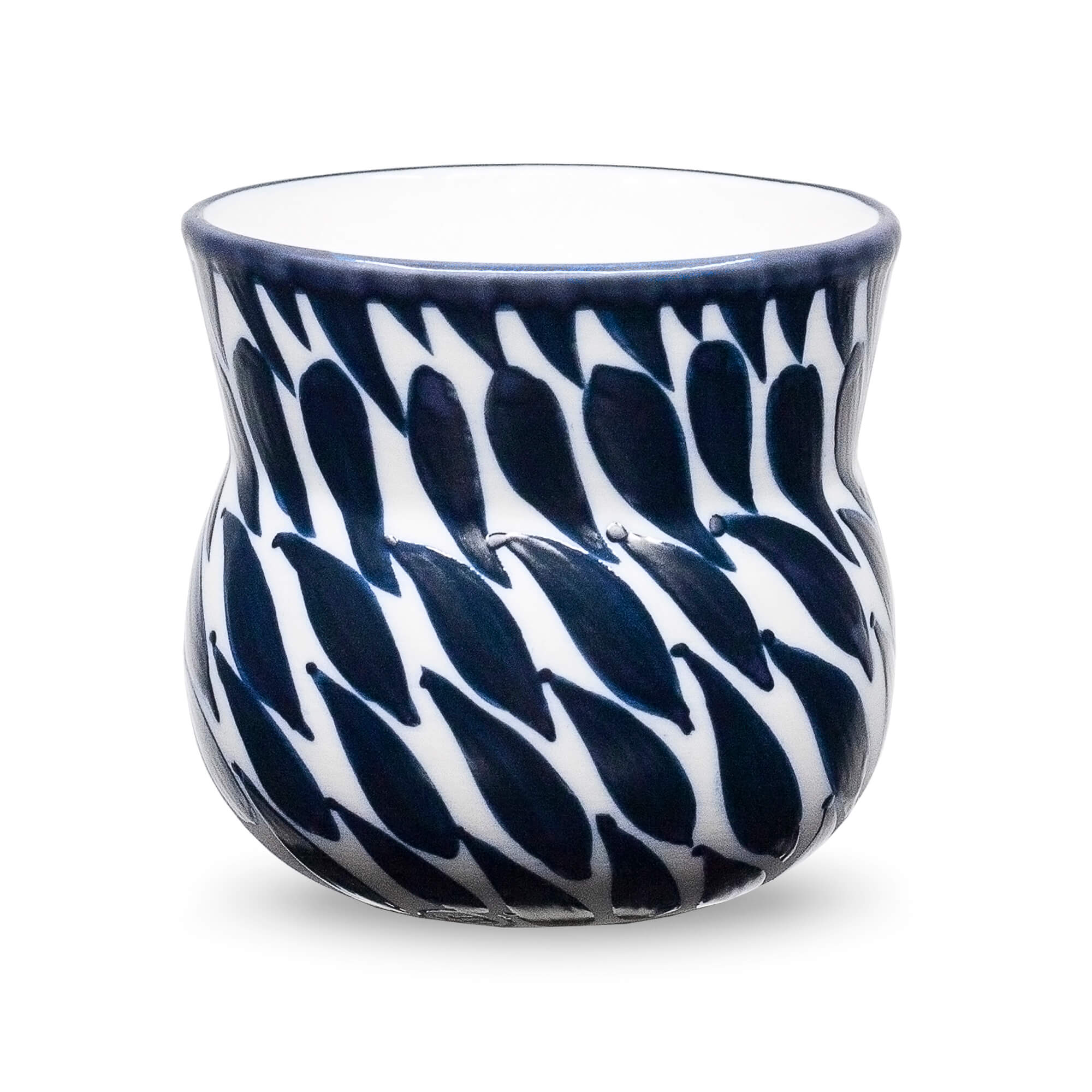 Veltibollinn með mynstrinu Dropar er mótaður úr hágæða postulíni og er mynstur bollans handmálað í hinum mest einkennandi og klassíska bláa lit Ingu Elínar.