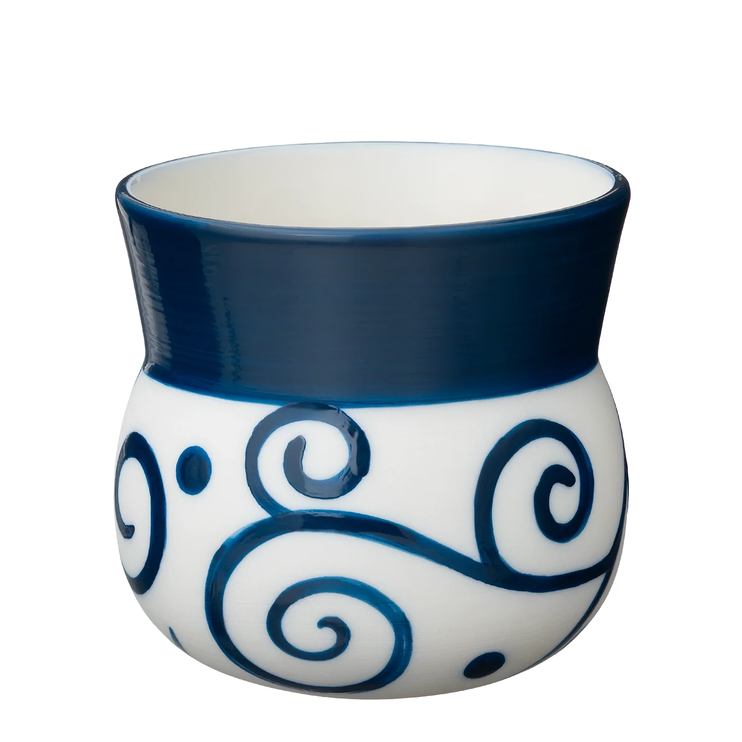 Veltibollinn með mynstrinu Lilja er mótaður úr hágæða postulíni og er mynstur bollans handmálað í hinum mest einkennandi og klassíska bláa lit Ingu Elínar.
