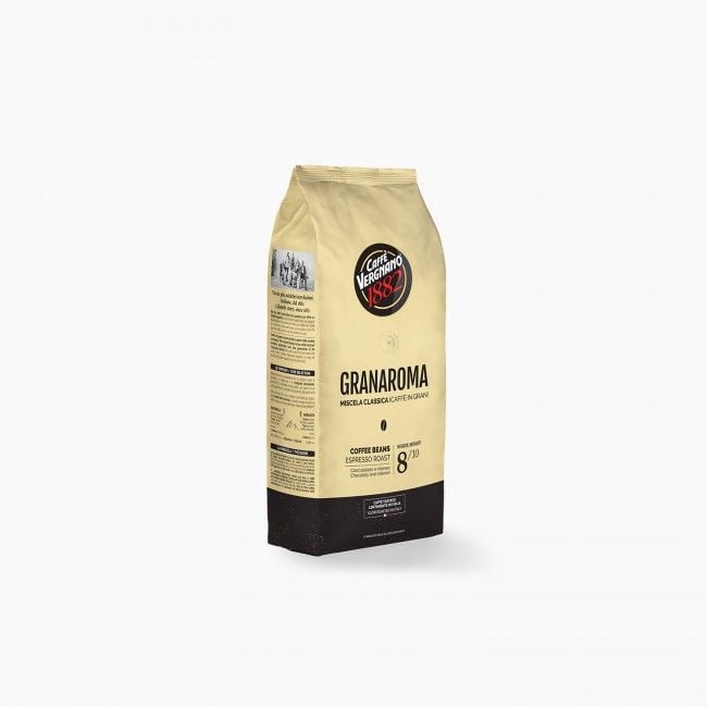 Gran Aroma kaffibaunir frá Caffe´ Vergnano. Fullkomin blanda fyrir þá sem njóta kaffis sem inniheldur mikla froðu, er vel uppbyggt með kröftugu bragði og kryddnótum. Fullkomið jafnvægi milli ilms og fyllingar fæst með því að blanda Arabica baunum og Robusta baunum í fullkomnum hlutföllum. Arabica baunirnar eru með mjög góðu og mildu bragði en þær koma frá Mið-Ameríku. Austurlensku og afrísku Robusta baunirnar eru sérvaldar og hafa sérstakan, ákafan ilm og notalegt eftirbragð með súkkulaðikeim.