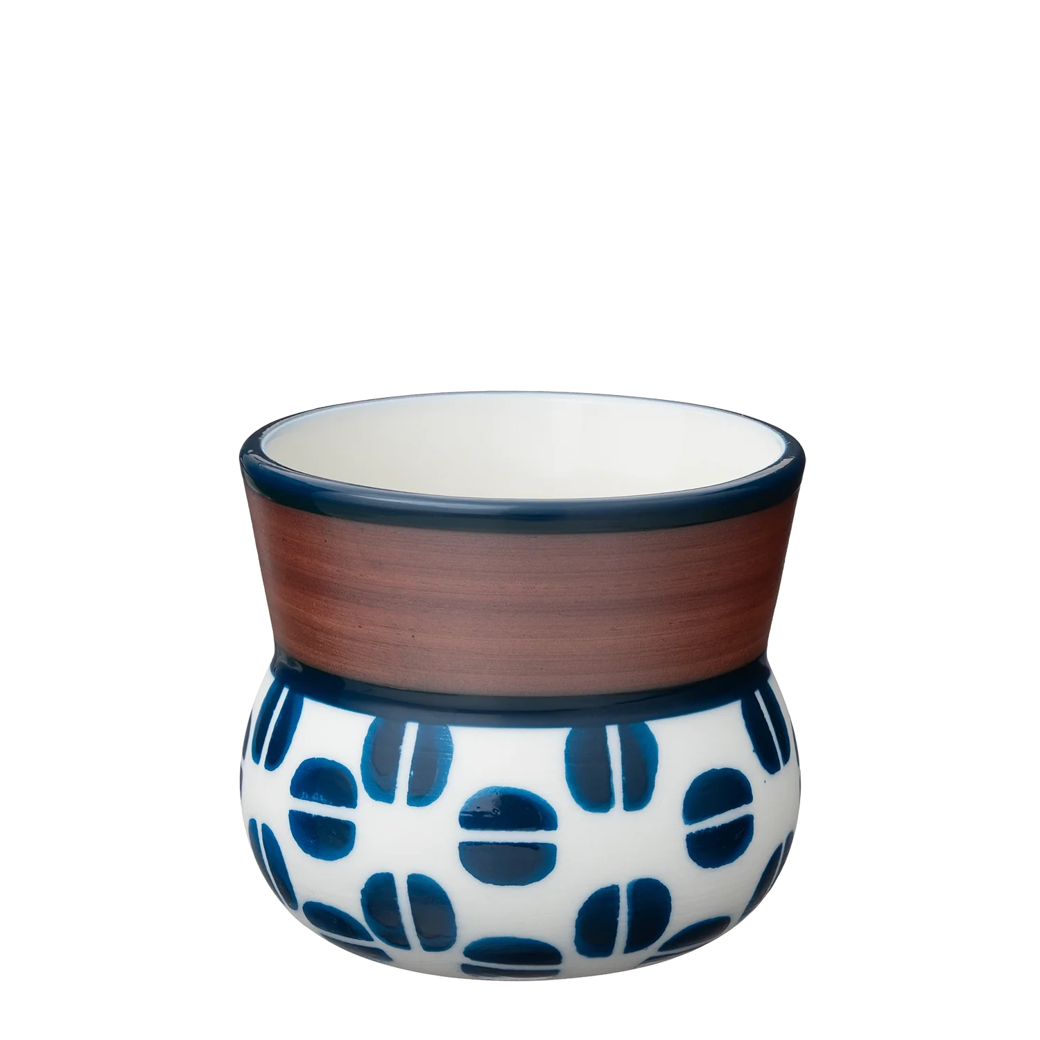 Espressobollinn með mynstrinu Kaffibaunir er mótaður úr hágæða postulíni, mynstur bollans er handmálað í hinum mest einkennandi og klassíska bláa og brúna lit Ingu Elínar.