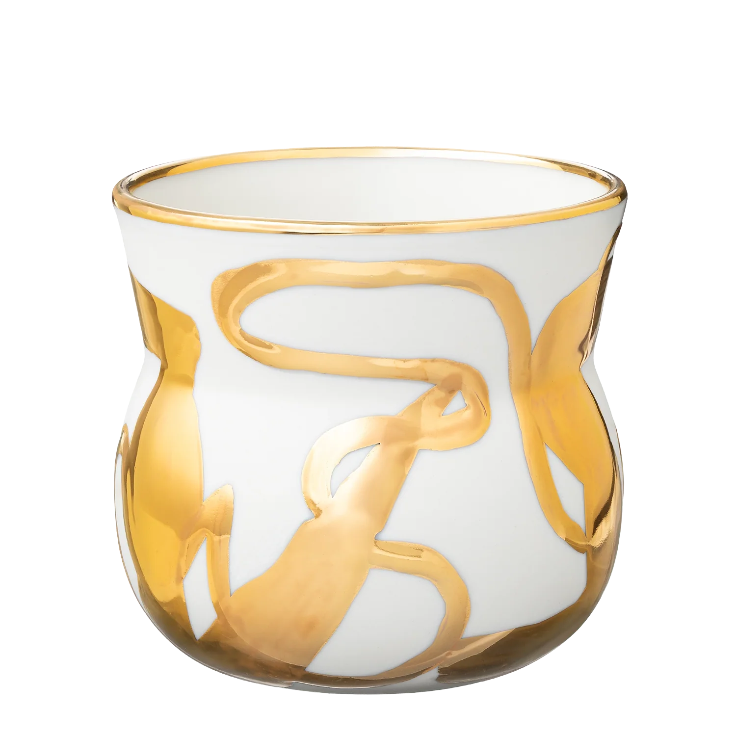Veltibollinn með mynstrinu Flæði er mótaður úr hágæða postulíni og er mynstur bollans handmálað tvisvar með þykkri og glansandi 24 karata gyllingu.
